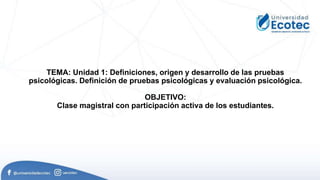Este documento presenta una clase magistral sobre las definiciones, orígenes y desarrollo de las pruebas psicológicas. Explica las diferentes clasificaciones de pruebas psicológicas, como las pruebas psicométricas versus las pruebas proyectivas, y los diferentes períodos en el desarrollo de las pruebas. También cubre temas como la validez, fiabilidad y normalización de las pruebas, y cómo se usan para medir constructos psicológicos.