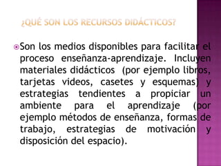Este documento discute los materiales didácticos y recursos para potenciar la identidad cultural y procesos de aprendizaje. Explica que los recursos didácticos incluyen materiales y estrategias que facilitan el aprendizaje, y deben tomar en cuenta las características de los estudiantes y el objetivo deseado. También describe los recursos de la comunidad como una forma de explicar conceptos y ponerlos en práctica, y cómo las características socioculturales de la comunidad influyen en el aprendizaje de los estudiantes.