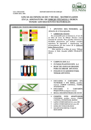 Este documento lista los materiales necesarios para los estudiantes matriculados en la asignatura de Dibujo Técnico I en el I.E.S. Heliche durante el curso 2015/2016. Incluye libros de texto recomendados como el de la Editorial Guadiel o los dos tomos de la Editorial Julián Palencia Pérez, así como útiles como carpetas, folios, escuadras, reglas, compases, lápices y gomas.