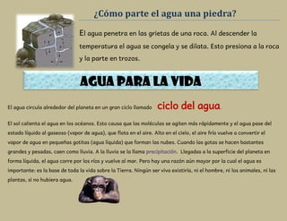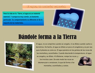 El agua tiene un comportamiento único al congelarse, dilatándose en lugar de comprimirse. Esto permite que el agua penetre en las grietas de las rocas, y al congelarse ejerce presión que parte las rocas, dando forma a las montañas, acantilados y costas a través de la erosión. El agua es esencial para la vida en la Tierra, circulando en un gran ciclo entre los océanos, la atmósfera y la superficie a través de la evaporación, condensación y precipitación.