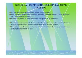 El documento describe los diferentes materiales utilizados a lo largo de la historia para fabricar objetos y herramientas, incluyendo piedra, bronce e hierro en las edades correspondientes. También explica la clasificación de los materiales en naturales, artificiales y sintéticos, y resume algunas de sus propiedades más importantes como resistencia y durabilidad. Por último, introduce brevemente los ensayos comunes utilizados para evaluar las características de los materiales.