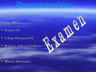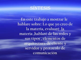 Este documento presenta un resumen de una práctica de la materia Informática. En él, el autor discute su opinión positiva sobre la materia, cómo ha aprendido habilidades como crear presentaciones. También evalúa la materia como importante y bien explicada. Finalmente, cubre conceptos clave como tipos de redes, elementos de arquitectura cliente-servidor y protocolos de comunicación.