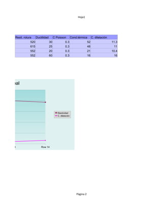 Este documento presenta una tabla con las propiedades de varios tipos de acero, incluyendo su densidad, elasticidad, resistencia a la fluencia, resistencia a la rotura, ductilidad, coeficiente de Poisson, conductividad térmica y coeficiente de dilatación térmica. La tabla muestra que el acero AISI 1040, 1080 y 446 son ferroso con densidades entre 7500-7850 kg/m3 y elasticidades alrededor de 200 GPa, mientras que el acero AISI 316 es más denso y menos elástico.