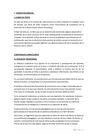 Este documento discute diferentes enfoques a la educación y los materiales curriculares. Describe las escuelas tradicionales, que se centran en el libro de texto y la transmisión de conocimientos del maestro a los estudiantes. También describe escuelas innovadoras que utilizan una variedad de recursos más allá del libro de texto para fomentar un aprendizaje más activo y centrado en el estudiante. El documento analiza las ventajas y desventajas de ambos enfoques y argumenta que si bien el libro de texto sig