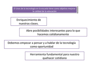 Los materiales audiovisuales son efectivos para captar la atención de los niños y transmitir conceptos de manera simple a través de imágenes. El uso de la tecnología en la escuela mejora la calidad de la educación al enriquecer las clases y abrir nuevas posibilidades. Para que el proceso de enseñanza sea significativo, los alumnos deben estar motivados mediante el trabajo en grupo, imágenes que orienten y motiven, y estrategias que despierten la curiosidad y faciliten la reflexión y extracción de conclusiones.