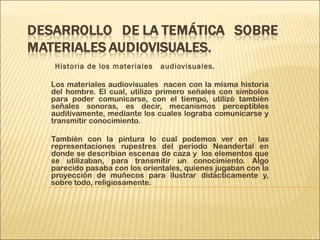Este documento resume la historia de los materiales audiovisuales. Comienza con las primeras formas de comunicación humana como señales y sonidos, y continúa describiendo el desarrollo de la fotografía, el cine mudo y sonoro. Luego explica la evolución de los soportes físicos como la película de celuloide y nitrato, y los avances en materiales como el acetato de celulosa y el poliéster. Finalmente, categoriza los diferentes tipos de materiales audiovisuales y sistemas de clasificación.