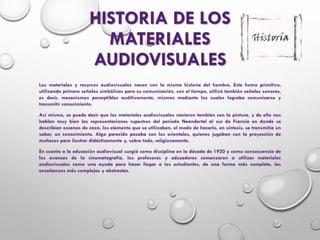 Este documento presenta una introducción a los materiales audiovisuales. Explica que estos surgieron desde los inicios del hombre con el uso de señales sonoras y simbólicas para comunicarse. En el siglo XIX y XX se desarrollaron nuevas tecnologías como la fotografía, el cine, la radio y la televisión que permitieron representar la realidad de forma más fiel mediante el sonido y la imagen. Finalmente, detalla algunos tipos de materiales audiovisuales como películas, mapas, fotografías, diapositivas y