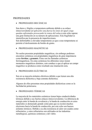 Los materiales cerámicos son compuestos inorgánicos constituidos principalmente por enlaces iónicos y/o covalentes entre elementos metálicos y no metálicos. Presentan estructuras cristalinas complejas como la perovskita y espinela. Son duros y frágiles, aislantes eléctricos y térmicos, y se usan ampliamente en alfarería, construcción, electrónica y como refractarios.