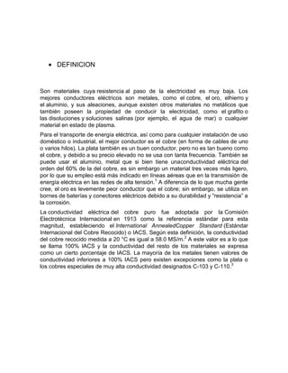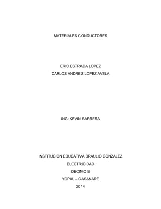 Este documento trata sobre los materiales conductores. Define los materiales conductores como aquellos cuya resistencia al paso de la electricidad es muy baja, como los metales como el cobre, el oro y el aluminio. Clasifica los conductores en metálicos, electrolíticos y gaseosos. Explica que los conductores metálicos usan la conducción electrónica mientras que los electrolíticos usan la conducción iónica. Finalmente, señala algunas aplicaciones comunes de los conductores como conducir electricidad de un punto a otro y cre