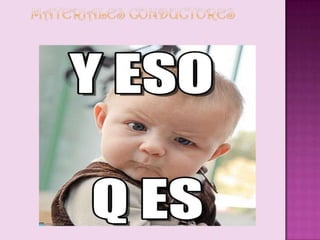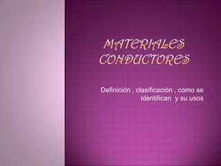 Este documento define los materiales conductores, los clasifica en dos grupos principales (de alta y baja conductividad), describe sus características y usos. Los materiales conductores son aquellos cuya resistencia al paso de la corriente eléctrica es baja y permiten el flujo continuo de electrones. Los mejores conductores son los metales como el cobre, plata y aluminio. Estos materiales se usan principalmente para transportar electricidad con baja pérdida.