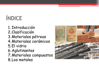 Este documento clasifica y describe los principales materiales de construcción, incluyendo materiales pétreos como la caliza y el granito, materiales cerámicos como ladrillos y tejas, vidrio, aglutinantes como el cemento y yeso, materiales compuestos como el mortero y hormigón, y metales como el aluminio y acero. Explica que estos materiales se utilizan ampliamente en la construcción de viviendas, edificios e infraestructuras como carreteras y puentes.