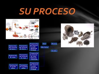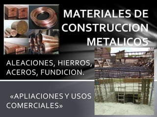 Este documento describe los procesos metalúrgicos para obtener diferentes metales como el hierro y el cobre a partir de minerales. Explica las etapas de trituración, lavado, molienda, calcinación y fusión necesarias para separar los metales de las gangas. También cubre los procesos siderúrgicos para producir acero y sus usos comerciales en barras, chapas, pernos y alambres para la construcción. Finalmente, detalla métodos para proteger los metales de la oxidación.