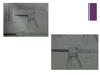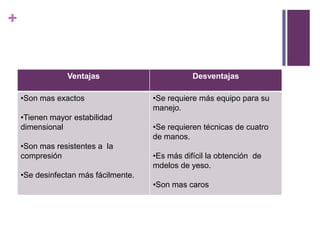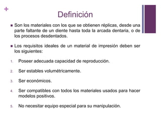 Este documento describe diferentes materiales utilizados para realizar impresiones dentales, incluyendo yesos, elastómeros y siliconas. Explica sus propiedades ideales, clasificaciones, manipulación y ventajas/desventajas. Los materiales de impresión deben reproducir con precisión la boca, ser estables dimensionalmente, económicos y fáciles de usar. Se clasifican según su rigidez y área de uso. Los elastómeros como polisulfuro, siliconas y poliéter cumplen estos requisitos y se introdu