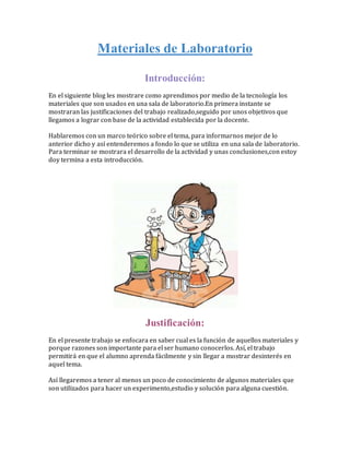 Este documento presenta una introducción a los materiales utilizados en un laboratorio de química. Explica la justificación y objetivos del trabajo, y proporciona un marco teórico sobre diferentes tipos de materiales como probetas, matraces, mecheros y soportes, describiendo la función de cada uno. Finalmente, menciona que se desarrolló una actividad práctica y se concluye resaltando la importancia de conocer estos materiales y trabajar de forma segura en el laboratorio.