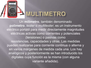 Este documento presenta descripciones breves de varios materiales y equipos de laboratorio comúnmente utilizados, incluyendo un multímetro para medir magnitudes eléctricas, un beaker de vidrio para disolver sustancias, un invernadero para cultivar plantas a mayor temperatura, un prisma de vidrio, una aspiradora para limpiar el polvo, sistemas de energía solar y eólica para generar electricidad de forma renovable, un robot mecánico o de software, un regulador para mantener constantes las variables, un autoclave para esterilizar