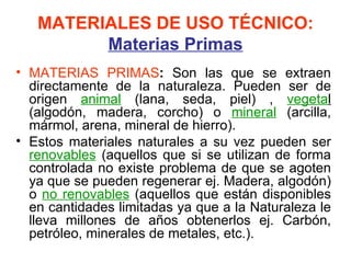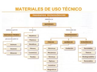 Este documento describe diferentes tipos de materiales de uso técnico, incluyendo materias primas, materiales transformados y productos tecnológicos. Explica que las materias primas se extraen directamente de la naturaleza y pueden ser renovables o no renovables. Los materiales transformados se obtienen mediante la transformación de las materias primas, como el papel, los metales y los plásticos sintéticos. Finalmente, analiza las propiedades físicas, químicas y mecánicas de los diferentes materiales y cómo estas prop