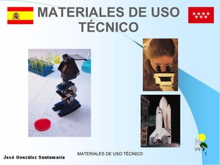 Este documento describe los diferentes tipos de materiales de uso técnico, incluyendo sus propiedades. Explica que los materiales se obtienen a partir de las materias primas extraídas de la naturaleza y se clasifican en seis grupos: maderas, plásticos, metales, materiales pétreos, materiales cerámicos y materiales textiles. También describe las cuatro categorías de propiedades de los materiales: físicas, químicas, mecánicas y ecológicas.