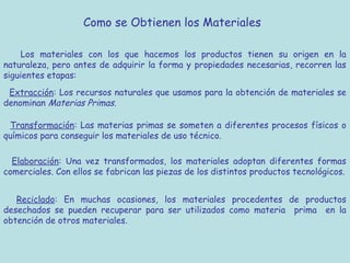 Este documento describe los materiales de madera y sus derivados. Explica cómo se obtienen los materiales a partir de recursos naturales y cómo se transforman y elaboran. Describe los tipos de madera, sus propiedades y aplicaciones comunes. También cubre temas como el trabajo con madera, uniones, acabados y el impacto ambiental de la explotación de los bosques.