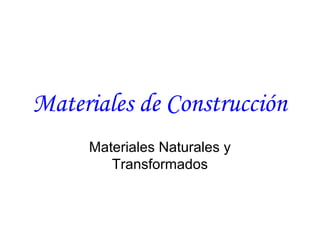 Este documento describe varios materiales de construcción naturales y transformados. Entre los materiales naturales se encuentran piedras como granito y mármol, pizarra y áridos. También se mencionan materiales orgánicos como madera, corcho y asfalto. Entre los materiales derivados del vidrio se encuentra el vidrio y la fibra de vidrio. Los materiales aglomerantes como el yeso y el cemento se usan para unir otros elementos. Finalmente, los materiales transformados incluyen cerámicas como ladrillos, tejas y azulejos, así