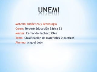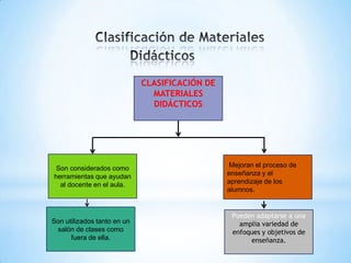 Los materiales didácticos se clasifican en materiales permanentes de trabajo, materiales impresos e informativos, materiales gráficos, material auditivo y nuevas tecnologías. Se consideran herramientas que ayudan al docente en el aula y mejoran el proceso de enseñanza y aprendizaje. Pueden adaptarse a diferentes enfoques educativos y objetivos de enseñanza. Algunos ejemplos son el pizarrón, libros, proyectores de acetatos, portafolios y videos documentales.