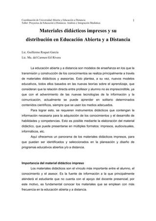 Este documento describe los diferentes tipos de materiales didácticos impresos utilizados en la educación abierta y a distancia, incluyendo guías de estudio, antologías, textos de autoestudio y paquetes didácticos. Explica las características, elementos estructurales y técnicas de diseño de estos materiales, así como el proceso de elaboración y distribución de los mismos.