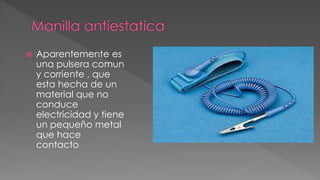 Este documento presenta una variedad de herramientas útiles para la reparación de computadoras. Incluye pinzas para agarrar objetos, juegos de destornilladores, un probador de fuentes de poder, discos duros portátiles para respaldos, linternas, sopladores y brochas para limpieza, limpiadores en aerosol para tarjetas de circuito, protectores para pantallas, y limpiadores de contactos eléctricos. El documento proporciona breves descripciones del uso y los beneficios de cada herramienta