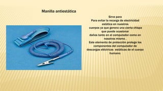 Este documento lista y describe varios insumos y herramientas comúnmente usados para el mantenimiento de computadoras personales, incluyendo manillas antiestáticas, pinzas, desarmadores de precisión, probadores de fuente de poder, cables, baterías portátiles, linternas LED, sopladoras, brochas, latas de aire comprimido, limpiadores de pantalla, grasa para procesadores y alcohol isopropílico. Cada elemento se describe brevemente en términos de su función y posibles riesgos asociados.