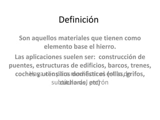 Este documento describe los materiales ferrosos, incluyendo hierro, acero y fundición. Explica que el hierro se obtiene en altos hornos a partir de óxidos de hierro y se usa principalmente para fabricar electroimanes. El acero contiene hierro y carbono, además de otros elementos. La fundición contiene entre 1.76% y 6.67% de carbono y se usa para fabricar carcasas y maquinaria. Finalmente, describe el proceso en un alto horno, donde se introducen mineral de hierro, coque y caliza para obt