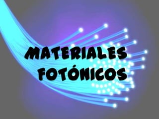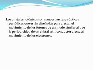 Los cristales fotónicos son nanoestructuras que afectan el movimiento de los fotones de manera similar a como la periodicidad de un cristal semiconductor afecta el movimiento de los electrones. El documento describe varios fenómenos ópticos como la reflexión, refracción, absorción y transmisión que ocurren cuando los fotones interactúan con materiales. También explica cómo ciertos materiales pueden exhibir absorción, transmisión o reflexión selectiva de la luz y da ejemplos del uso de diferentes tipos de radiación electromagnética como los