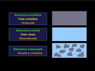 Este documento describe diferentes materiales utilizados en odontología, incluyendo metales, aleaciones metálicas, resinas compuestas y cerámicas. Explica las propiedades físicas de los metales y las aleaciones comúnmente usadas, así como los componentes y propiedades de las resinas compuestas. Finalmente, detalla los métodos de elaboración de cerámicas dentales, incluyendo condensación sobre muñón refractario, sustitución a la cera perdida y tecnología asistida por computador.