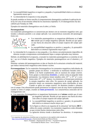 Este documento presenta los diferentes tipos de materiales magnéticos, incluyendo diamagnéticos, paramagnéticos, ferromagnéticos, antiferromagnéticos y ferrimagnéticos. Describe las características clave de cada uno y provee ejemplos. También explica conceptos como temperatura de Curie, dominios magnéticos, y diferentes estructuras cristalinas asociadas con cada tipo de material magnético.