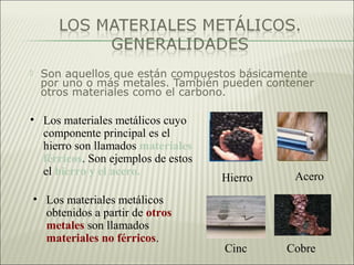 El documento habla sobre los materiales metálicos. Explica que son aleaciones de uno o más metales que conducen bien el calor y la electricidad. Describe los principales metales como el hierro, acero, cobre, aluminio, estaño y cinc. Explica cómo se obtienen, sus usos y formas comerciales. También cubre procesos como la fundición, aleación, trabajos mecánicos y técnicas de unión.