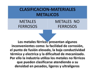 Los metales no férricos tienen ventajas sobre los metales férricos como menor facilidad de corrosión, menor punto de fusión, mayor conductividad térmica y eléctrica y mayor facilidad de mecanizado. Los metales no férricos se clasifican en pesados, ligeros y ultraligeros dependiendo de su densidad y comprenden aleaciones de aluminio, magnesio, titanio, cobre y zinc, así como materiales refractarios y metales preciosos.