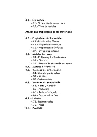 El documento describe los materiales metálicos, su obtención y clasificación, incluyendo metales ferrosos y no ferrosos, así como sus propiedades físicas, químicas y ecológicas. Se detalla el proceso de extracción y transformación de los metales, con énfasis en el acero y sus aleaciones, así como las técnicas de conformación y manipulación. Finalmente, se abordan las características y usos de diferentes metales, destacando su importancia en diversas industrias.