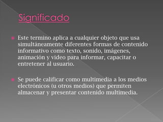 Este documento define multimedia como cualquier objeto que usa múltiples formas de contenido como texto, sonido, imágenes, animación y video. Explica que el contenido multimedia puede ser lineal o no lineal e interactivo, y que se puede ver, proyectar, transmitir o reproducir localmente. Finalmente, detalla los diferentes tipos de contenido multimedia como texto, gráficos, imágenes, animación, video y sonido.