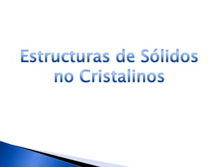 Los materiales no cristalinos carecen de un arreglo tridimensional y presentan un orden de corto alcance, permitiendo que se solidifiquen de manera gradual sin un punto de fusión definido. Su estructura puede ser afectada por factores como la longitud de las cadenas moleculares y la presencia de grupos laterales grandes, lo que explica su naturaleza amorfa y características como la transparencia. Ejemplos incluyen polímeros como el polietileno y vidrios como la sílice, que pueden formar estructuras no cristalinas bajo ciertas condiciones de enfriamiento.