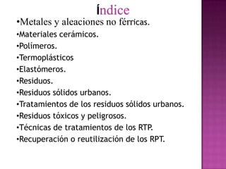 1. El documento trata sobre diferentes materiales como metales, aleaciones, materiales cerámicos, polímeros y residuos.