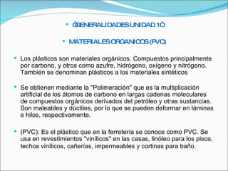 Este documento trata sobre el PVC (policloruro de vinilo), un plástico común. Explica que los plásticos son materiales orgánicos derivados del petróleo que se obtienen mediante la polimerización. Luego describe las propiedades térmicas, mecánicas, eléctricas y químicas del PVC, incluyendo su resistencia a sustancias químicas, impermeabilidad y baja absorción de agua. Finalmente, menciona algunos ejemplos comunes de aplicaciones del PVC como tub