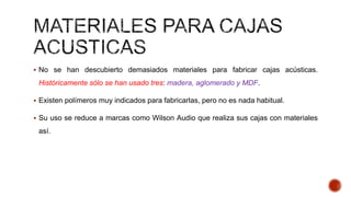 El documento discute diferentes materiales para fabricar cajas acústicas, incluyendo madera, aglomerado, MDF y polímeros. Explica que el tipo y espesor de aglomerado afecta su calidad, y que el MDF tiende a resonar entre 200-400 Hz. También analiza el uso de corcho y moqueta en el interior de las cajas para absorber diferentes frecuencias.