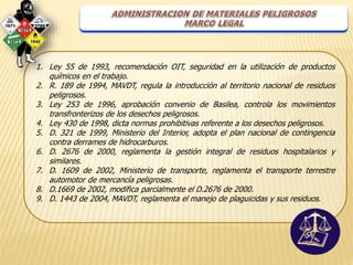1. El documento describe los requisitos y procedimientos para el manejo seguro y transporte de sustancias y residuos peligrosos, incluyendo la identificación, clasificación, etiquetado, almacenamiento e inventario de estos materiales.