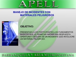 Este documento presenta información sobre la respuesta a incidentes con materiales peligrosos. Explica los diferentes niveles de competencia profesional requeridos para responder a estos incidentes según la norma NFPA 472, así como métodos para el reconocimiento e identificación de materiales peligrosos basados en la ubicación del incidente, características de los contenedores, placas y etiquetas de identificación. También define conceptos clave como material peligroso, incidente, exposición y clasificación de materiales según la ONU.