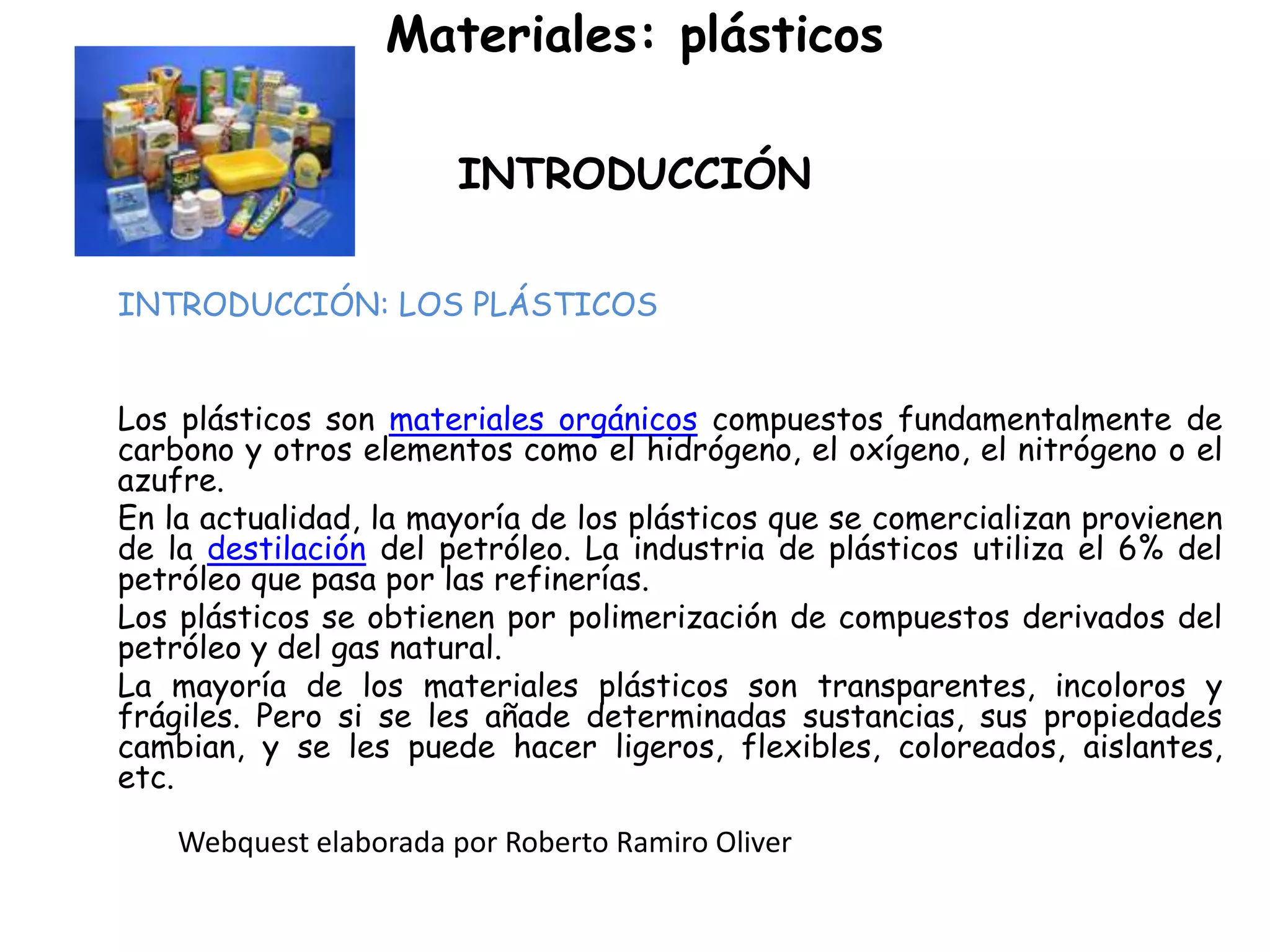 Este documento presenta una webquest sobre materiales plásticos. Propone varias tareas de investigación sobre las propiedades de los plásticos, polímeros comunes, tipos de plásticos, aditivos y técnicas de moldeado. Los estudiantes deben trabajar en parejas para investigar estos temas, presentar un informe escrito y una presentación oral. Serán evaluados en base a su participación, fuentes consultadas, organización, presentación y habilidades informáticas.