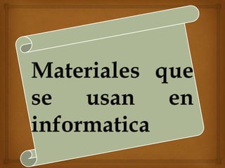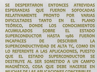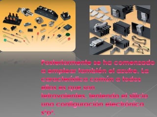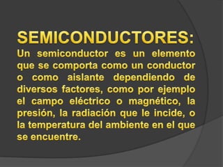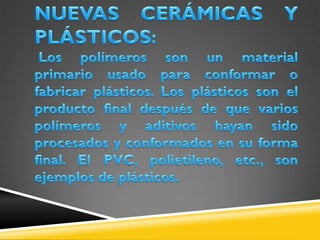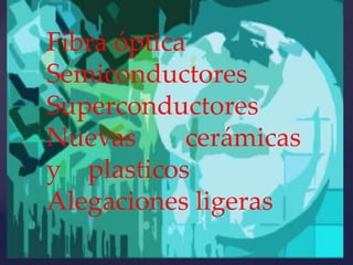 El documento trata sobre varios temas relacionados con materiales avanzados como la fibra óptica, semiconductores, superconductores, nuevas cerámicas, vidrios especiales y aleaciones ligeras. Describe cómo la fibra óptica transmite luz a través de reflexión total interna y se usa en telecomunicaciones. También explica los elementos semiconductores más comunes como el silicio y germanio y los primeros superconductores descubiertos.