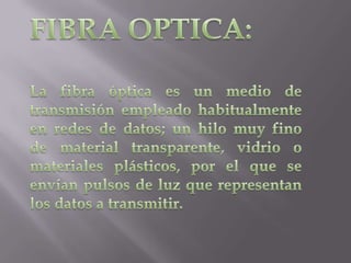 El documento trata sobre fibra óptica, semiconductores, superconductores, nuevos cerámicos y plásticos, y aleaciones ligeras. Describe cómo la fibra óptica transmite luz a grandes distancias mediante reflexión total, y cómo se utiliza en telecomunicaciones. También explica los procesos de fabricación de fibra óptica y lista los elementos semiconductores más comunes. Además, resume el descubrimiento de los superconductores y los materiales desarrollados con temperaturas críticas más altas. Finalmente, menciona