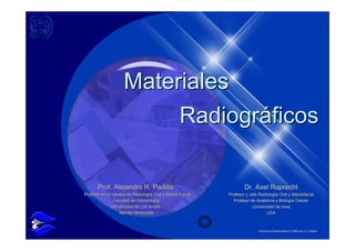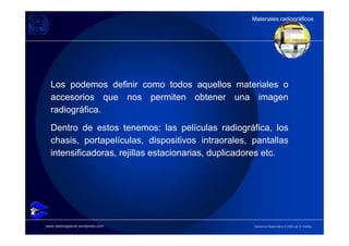 El documento presenta una descripción detallada de los materiales radiográficos utilizados en odontología, incluyendo tipos de películas, chasis, portapelículas y dispositivos intraorales. Se abordan las diferentes técnicas de radiografía, su indicación y evolución histórica, enfatizando la importancia de la reducción de la dosis de radiación en el paciente. Finalmente, se detalla la composición y funcionamiento de las películas radiográficas y su clasificación según características específicas.