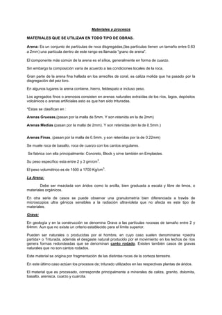 El documento describe varios materiales comúnmente usados en construcción como la arena, grava y yeso. La arena se clasifica por tamaño de partícula y se compone principalmente de sílice. La grava se origina de la fragmentación de rocas y tiene un tamaño entre 2mm y 6cm. El yeso se obtiene a partir de la piedra de yeso mediante deshidratación y se usa para fraguar cuando se mezcla con agua.