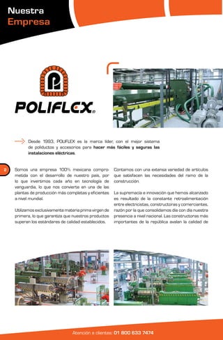 Poliflex es una empresa mexicana líder en la producción de poliductos y accesorios eléctricos. Ofrece una amplia variedad de productos de polietileno como poliductos naranjas, rojos y verdes con diferentes especificaciones para usos residenciales e industriales. Poliflex busca ofrecer soluciones eléctricas seguras y eficientes para hogares y construcciones mexicanas.