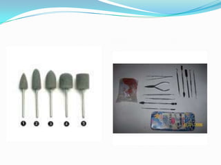 Este documento lista materiales y herramientas utilizados en odontología, incluyendo yesos dentales, ceras dentales, alginato, instrumental, placa neuromiorelajante, modelinas, mercaptano, silicona, pasta zincenólica, cubetas metálicas y de plástico, resinas acrílicas de auto y termpolimerización, y materiales para pulido y brillo de prótesis dentales.