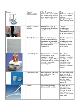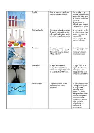 El documento describe diferentes materiales e instrumentos utilizados en un laboratorio químico, incluyendo su composición, función y usos principales. Algunos de los elementos mencionados son balanzas analíticas de acero inoxidable para medir pequeñas masas, matraces de destilación de vidrio para separar líquidos mediante destilación, agitadores magnéticos electrónicos para mezclar de forma automática, crisoles de porcelana para calentar y fundir sustancias, y tubos de ensayo de vidrio para preparar soluciones. La