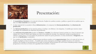 El materialismo histórico explica los cambios sociales y políticos a partir de los cambios en la base material de la sociedad, que incluye las fuerzas productivas (materias primas, trabajo y maquinaria) y las relaciones de producción (quién posee los medios de producción). Los cambios en la base material producen cambios en la superestructura, que incluye las leyes, el estado, la religión y la moral. El materialismo histórico fue desarrollado por Marx y Engels para comprender científicamente la sociedad burguesa y la transición